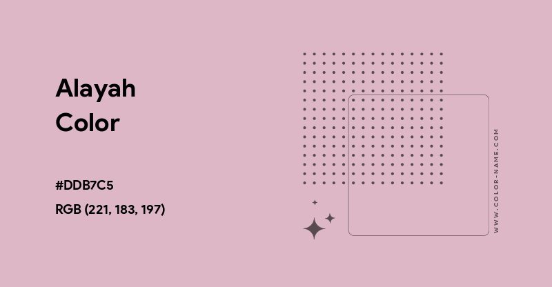 Alayah has the hex code #DDB7C5. The equivalent RGB values are (221, 183, 197), which means it is composed of 37% red, 30% green and 33% blue. The CMYK color codes, used in printers, are C:0 M:17 Y:11 K:13. In the HSV/HSB scale, Alayah has a hue of 338°, 17% saturation and a brightness value of 87%.