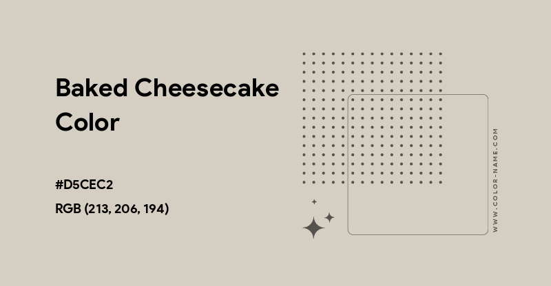 Baked Cheesecake has the hex code #D5CEC2. The equivalent RGB values are (213, 206, 194), which means it is composed of 35% red, 34% green and 32% blue. The CMYK color codes, used in printers, are C:0 M:3 Y:9 K:17. In the HSV/HSB scale, Baked Cheesecake has a hue of 38°, 9% saturation and a brightness value of 84%.