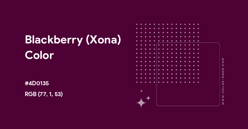 Blackberry (Xona) color is not included in the web list and cannot be used by name in HTML and CSS code. However, Blackberry (Xona) can be applied to web pages with its hex code, RGB and/or HSL values. Please note that the CMYK numbers listed on this page have been derived from the hexadecimal color code using known formulae and are only approximates.