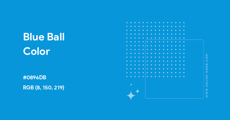 Blue Ball has the hex code #0896DB. The equivalent RGB values are (8, 150, 219), which means it is composed of 2% red, 40% green and 58% blue. The CMYK color codes, used in printers, are C:96 M:32 Y:0 K:14. In the HSV/HSB scale, Blue Ball has a hue of 200°, 96% saturation and a brightness value of 86%.