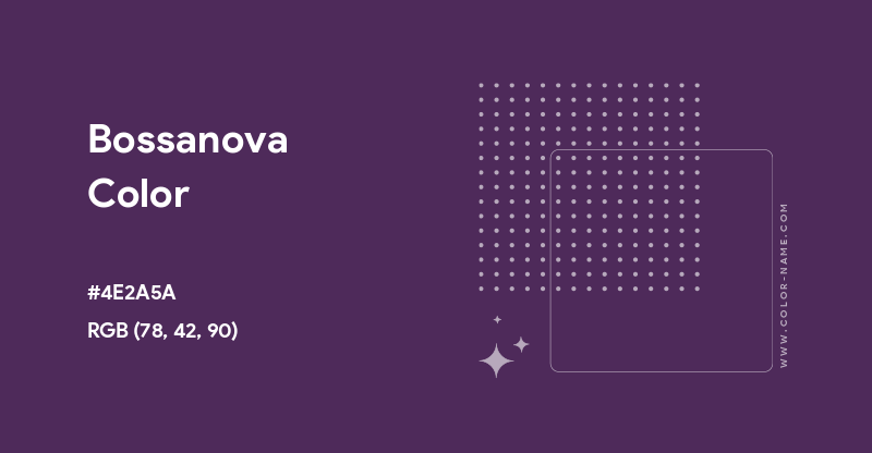 Bossanova has the hex code #4E2A5A. The equivalent RGB values are (78, 42, 90), which means it is composed of 37% red, 20% green and 43% blue. The CMYK color codes, used in printers, are C:13 M:53 Y:0 K:65. In the HSV/HSB scale, Bossanova has a hue of 285°, 53% saturation and a brightness value of 35%.