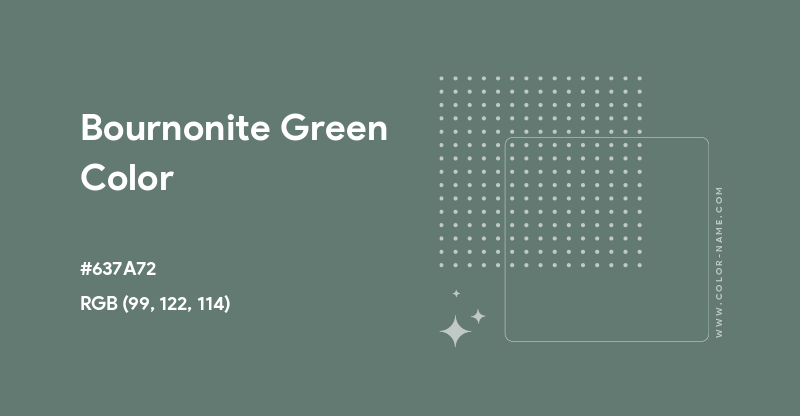 Bournonite Green color hex code is #637A72 which can be used along with RGB (99, 122, 114) or HSL values in HTML and/or CSS to display the color on web pages. Please note that the corresponding CMYK color values and the Pantone (PMS) number listed on this page have been calculated from the hexadecimal color code and are only approximations.