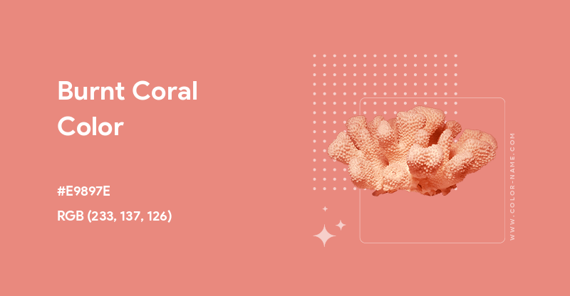 Burnt Coral color hex code is #E9897E with RGB (233, 137, 126). Please note that the equivalent RAL and CMYK values mentioned on this page have been derived from the hexadecimal code and are only approximates.