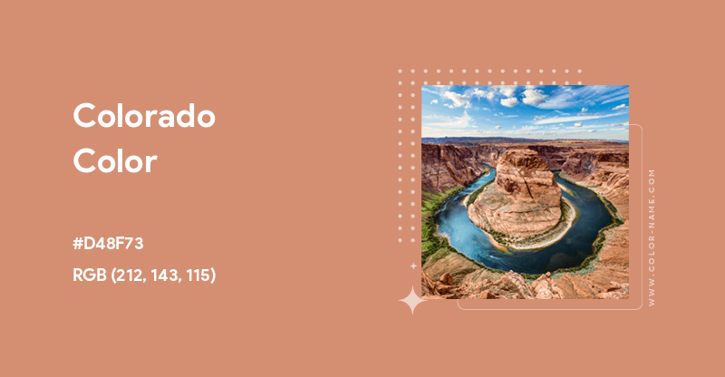Colorado has the hex code #D48F73. The equivalent RGB values are (212, 143, 115), which means it is composed of 45% red, 30% green and 24% blue. The CMYK color codes, used in printers, are C:0 M:33 Y:46 K:17. In the HSV/HSB scale, Colorado has a hue of 17°, 46% saturation and a brightness value of 83%.