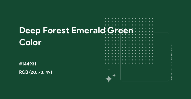 Deep Forest Emerald Green has the hex code #144931. The equivalent RGB values are (20, 73, 49), which means it is composed of 14% red, 51% green and 35% blue. The CMYK color codes, used in printers, are C:73 M:0 Y:33 K:71. In the HSV/HSB scale, Deep Forest Emerald Green has a hue of 153°, 73% saturation and a brightness value of 29%.