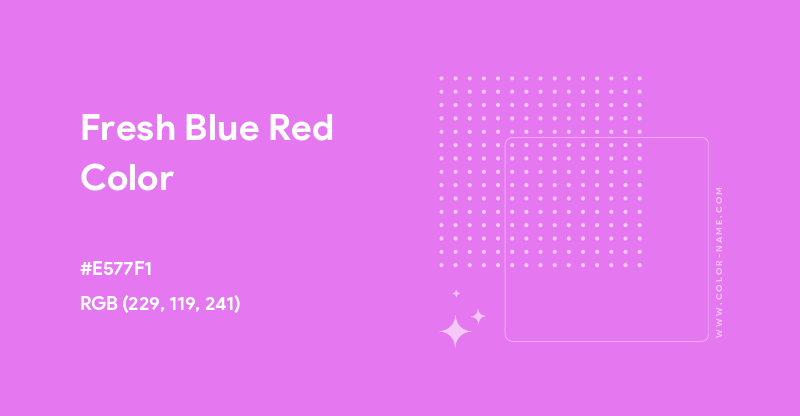 Fresh Blue Red has the hex code #E577F1. The equivalent RGB values are (229, 119, 241), which means it is composed of 39% red, 20% green and 41% blue. The CMYK color codes, used in printers, are C:5 M:51 Y:0 K:6. In the HSV/HSB scale, Fresh Blue Red has a hue of 294°, 51% saturation and a brightness value of 95%.