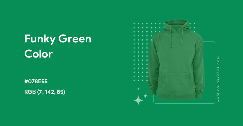 Funky Green has the hex code #078E55. The equivalent RGB values are (7, 142, 85), which means it is composed of 3% red, 61% green and 36% blue. The CMYK color codes, used in printers, are C:95 M:0 Y:40 K:44. In the HSV/HSB scale, Funky Green has a hue of 155°, 95% saturation and a brightness value of 56%.