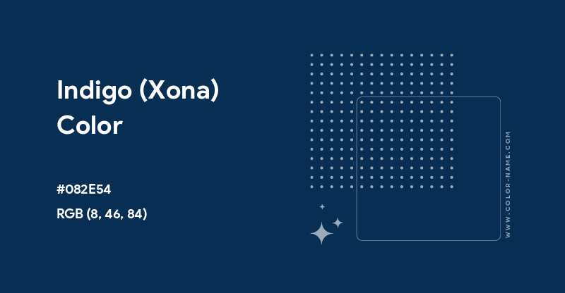 Indigo (Xona) has the hex code #082E54. The equivalent RGB values are (8, 46, 84), which means it is composed of 6% red, 33% green and 61% blue. The CMYK color codes, used in printers, are C:91 M:45 Y:0 K:67. In the HSV/HSB scale, Indigo (Xona) has a hue of 210°, 90% saturation and a brightness value of 33%.
