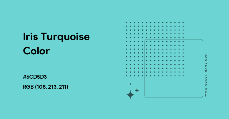 Iris Turquoise has the hex code #6CD5D3. The equivalent RGB values are (108, 213, 211), which means it is composed of 20% red, 40% green and 40% blue. The CMYK color codes, used in printers, are C:49 M:0 Y:1 K:17. In the HSV/HSB scale, Iris Turquoise has a hue of 179°, 49% saturation and a brightness value of 84%.