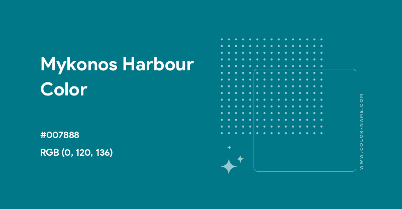 Mykonos Harbour has the hex code #007888. The equivalent RGB values are (0, 120, 136), which means it is composed of 0% red, 47% green and 53% blue. The CMYK color codes, used in printers, are C:100 M:12 Y:0 K:47. In the HSV/HSB scale, Mykonos Harbour has a hue of 187°, 100% saturation and a brightness value of 53%.