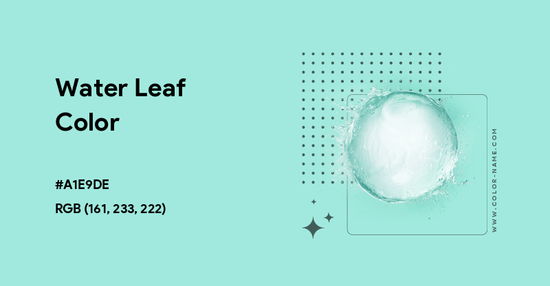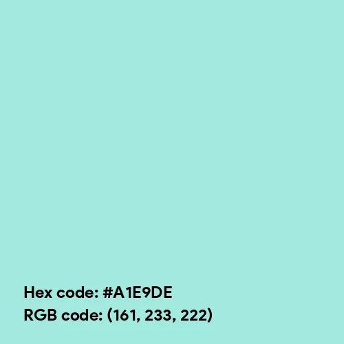 Water Leaf has the hex code #A1E9DE. The equivalent RGB values are (161, 233, 222), which means it is composed of 26% red, 38% green and 36% blue. The CMYK color codes, used in printers, are C:31 M:0 Y:5 K:9. In the HSV/HSB scale, Water Leaf has a hue of 171°, 31% saturation and a brightness value of 91%.