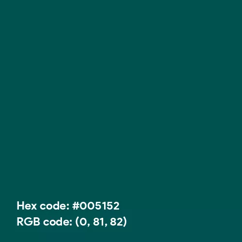 Wool Turquoise color hex code is #005152 which can be used along with RGB (0, 81, 82) or HSL values in HTML and/or CSS to display the color on web pages. Please note that the corresponding CMYK color values and the Pantone (PMS) number listed on this page have been calculated from the hexadecimal color code and are only approximations.