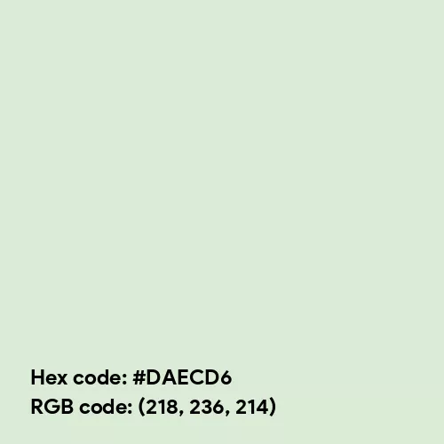 Zanah has the hex code #DAECD6. The equivalent RGB values are (218, 236, 214), which means it is composed of 33% red, 35% green and 32% blue. The CMYK color codes, used in printers, are C:8 M:0 Y:9 K:8. In the HSV/HSB scale, Zanah has a hue of 109°, 9% saturation and a brightness value of 93%.